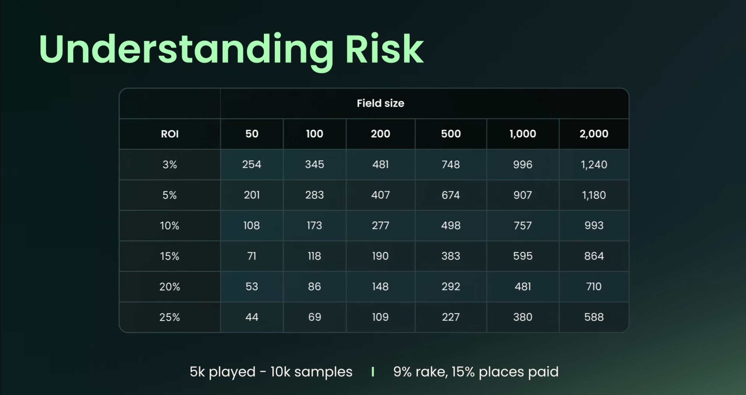 Здесь важно учитывать, что чем больше в турнирах участников / входов — тем большую важность имеет фактор удачи (выбросы дисперсии), поскольку для успешной игры вам приходится выигрывать больше флипов.