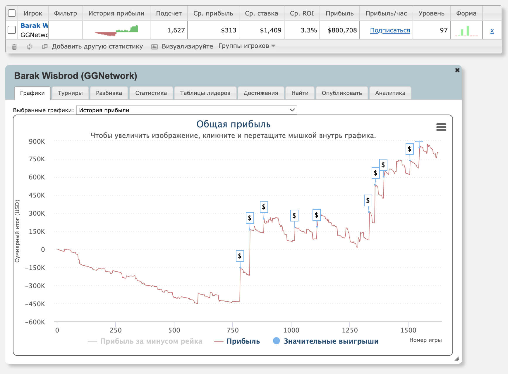 По данным SharkScope, Барак Висброд с 2022 года оформил $800K профита в турнирах онлайн.