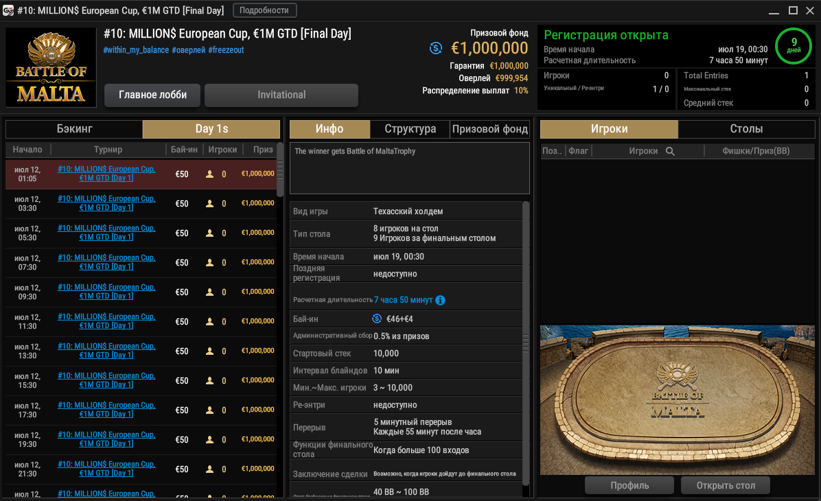 | 18 июля | 22:30 | #10: MILLION$ European Cup, €1M GTD [Final Day] | €50 | €1M |