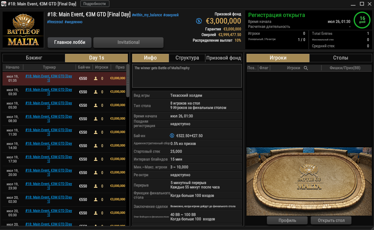 | 25 июля | 23:30 | #18: Main Event, €3M GTD [Final Day] | €550 | €3M |