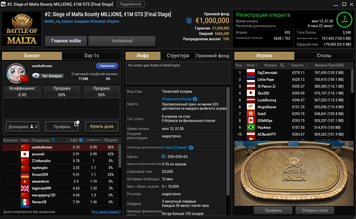 - €105 Siege of Malta Bounty MILLION$ €1M GTD — финал 11 июля 23:30 МСК. Флайты проходят ежедневно вплоть до финального дня.