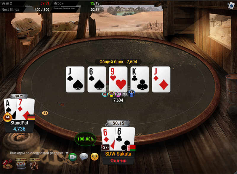 - Рейк: 5% (в турнирах за $0,25 рейк 4%).