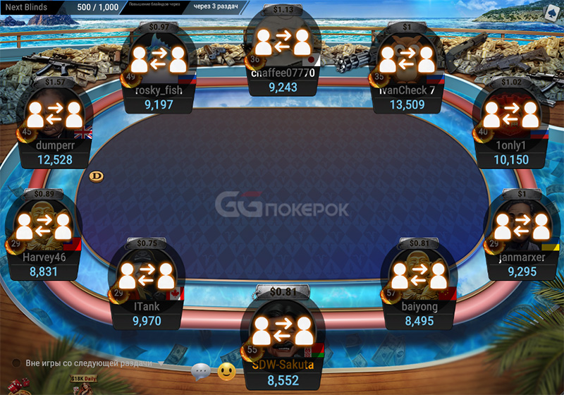 Важно! Тот, кто раньше всех выбивает всех оппонентов, выбирает место за финальным столом последним. - Final Table (10-макс, СНГ) — проходит как обычный финальный стол турнира с нокаутами. Вот только здесь все игроки попадают в деньги (до этого момента заработать можно было только за счет баунти). Этот этап максимально похож на обычный финальный стол турнира на GG: