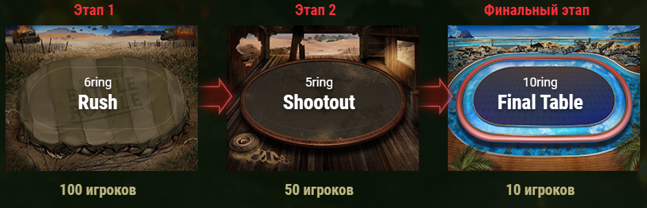 - Rush (6-макс, Rush) — продолжается до тех пор, пока в игре не останется 50 человек. Рост блайндов каждые 3 минуты. Формат — Rush (сразу после нажатия на кнопку «пас» начинается следующая раздача). После 15 минут игроки, не вошедшие в топ-50 общего чипкаунта, вылетают из игры (а награды за их выбивание включаются в общий призовой фонд).