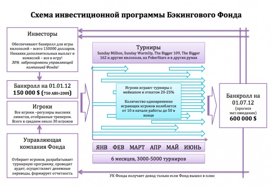 К 1 января 2012 года формируется банкролл в 150000 долларов (расчитан как 750 байинов по 200 долларов), 30% которого на равных правах с другими инвесторами вносит Управляющая Компания Фонда (то есть ваш покорный слуга); на эти дeньги в течение 6 месяцев играется 3000-5000 килополей типа  Sunday Million или The Bigger 109 (минимально гарантированная мной цифра - 2000 турниров, за недостижение ее управляющая компания фонда заплатит инвесторам штраф).