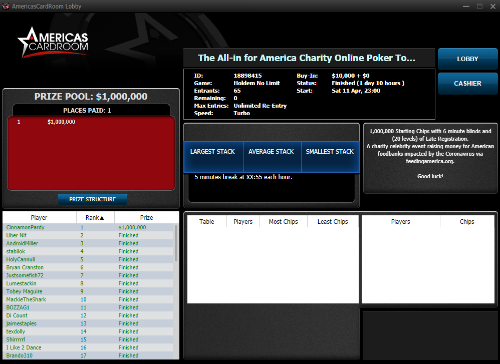 Турнир за $10,000 собрал 65 входов ($650,000 на благотворительность), а по ходу прямого эфира зрители пожертвовали ещё около $580,000. Ко всей этой сумме AmericasCardRoom добавил $1,000,000 — напомню, всё пойдёт в фонд Feeding America.