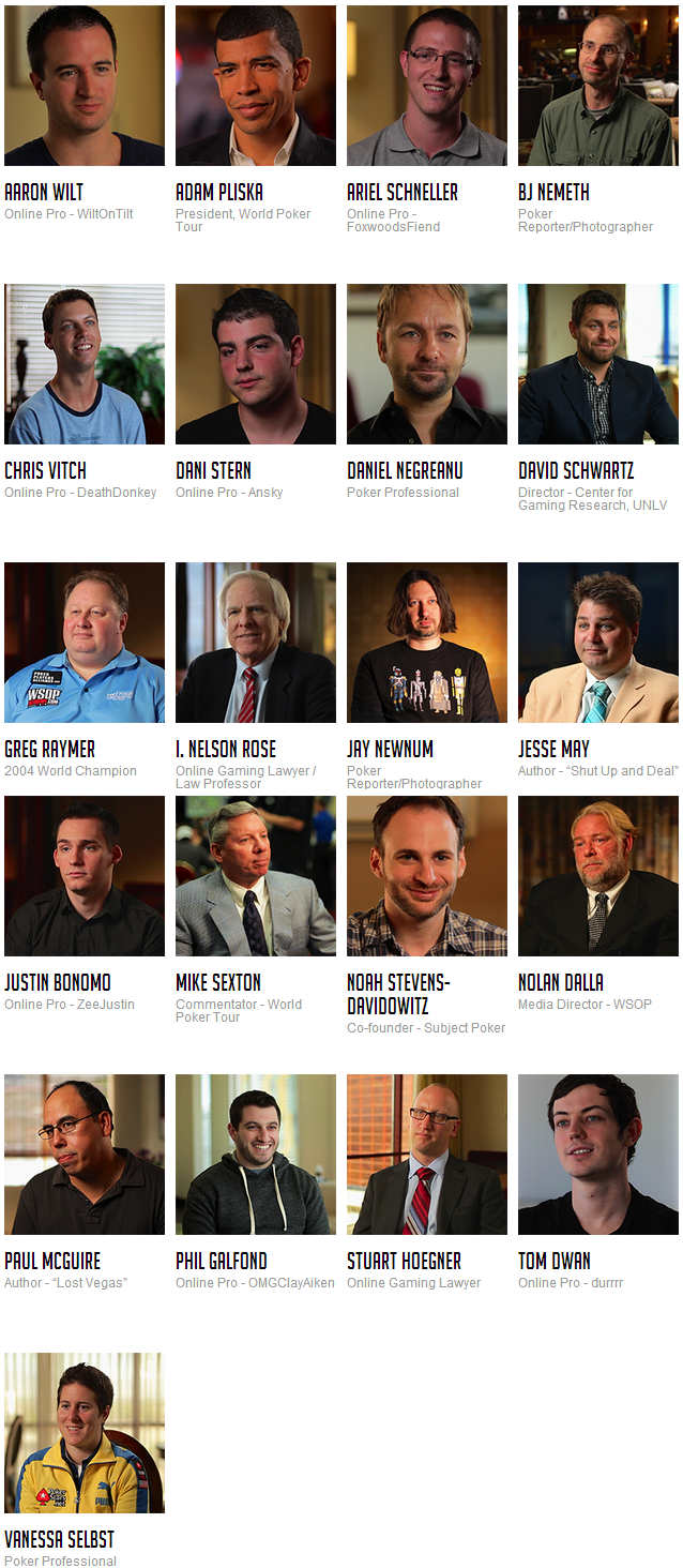 Помимо основных героев, в фильме будут заметны и многие другие покерные деятели. Кто-то из них случайно попал в камеру, а большинство из них давало развернутые интервью по тому или иному поводу создателям фильма. В BET RAISE FOLD: The Story of Online Poker мы увидим: