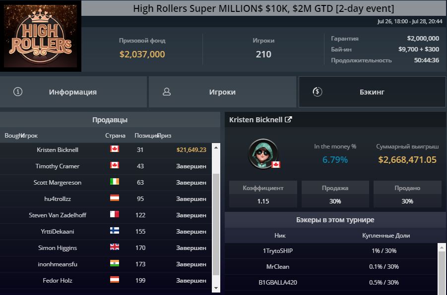 Кстати, в этом турнире можно было бэкнуть Федора Хольца, правда, денег вы с этого мероприятия не получили бы. Федя вылетел 199-м. А, например, 1% долька Кристен Бикнелл, купленная за $115, принесла бы вам $216.