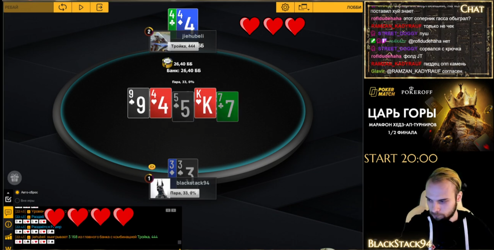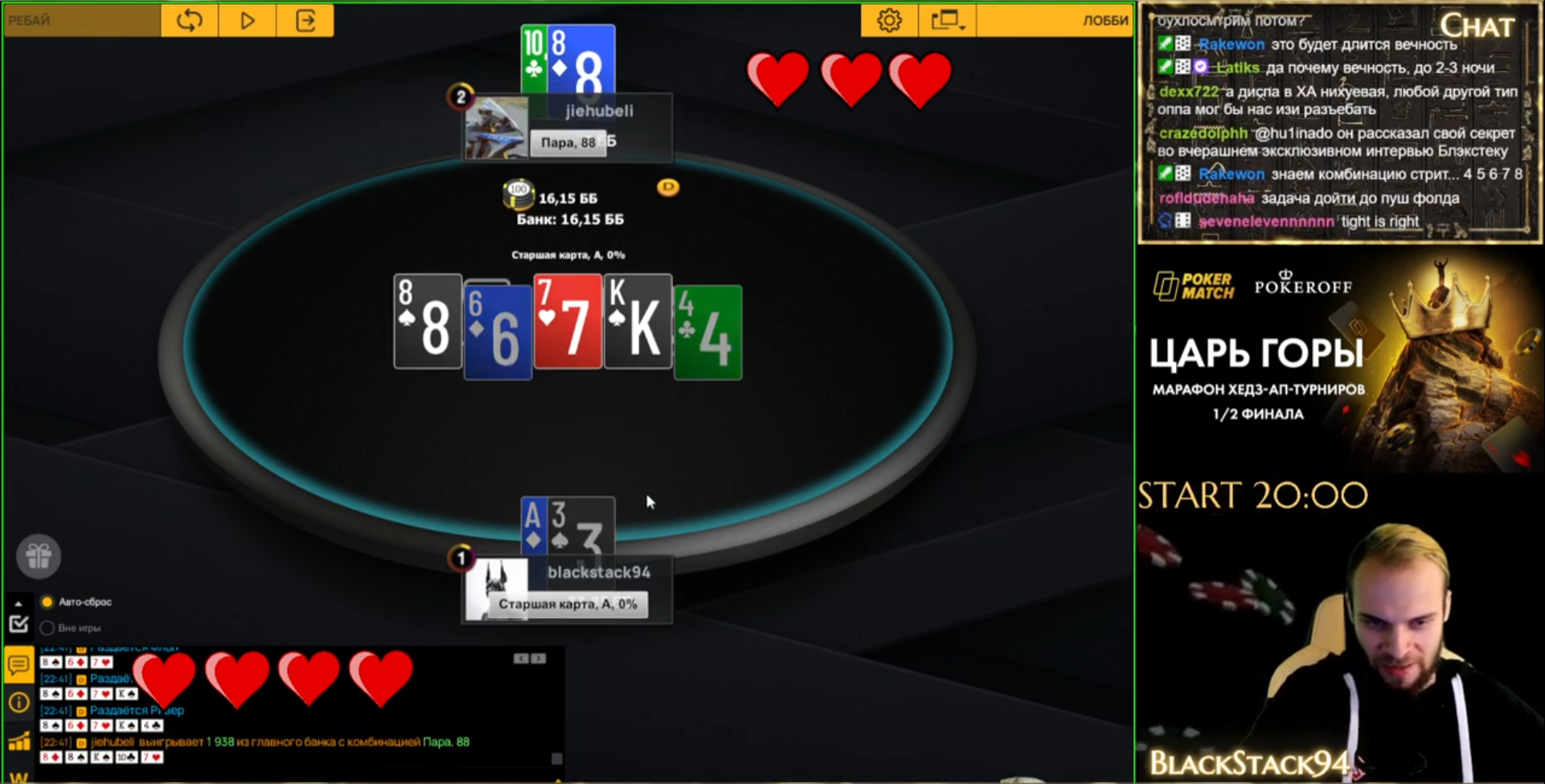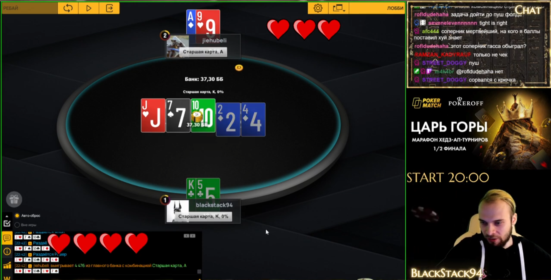 После этого поочерёдно выигрывая раунды, ребята подошли к решающему девятому матчу. Он получился очень плотным — поначалу BlackStack94 удерживал преимущество по стеку, но череда неудачных раздач привела к тому, что довольно быстро Михаил стал уступать и в какой-то момент — имея 29 ББ на руках против 43 ББ у jiehubeli — вынужден был пойти олл-ин с А3s. Эта рука могла бы стать финальной, потому что Василий заколлировал его с AQs, но в этот раз ГСЧ оказался на стороне стримера, дав ему заветную тройку и позволив получить пятикратное преимущество.