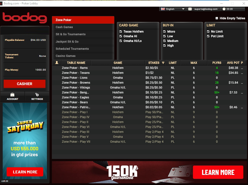 Всего в руме пять категорий игр — Zone Poker (аналог Zoom на кэш), Cash Games (классический кэш), Sit & Go Tournaments (обычные SnG), Jackpot Sit & Go (аналог Spin&Go) и Scheduled Tournaments (МТТ).