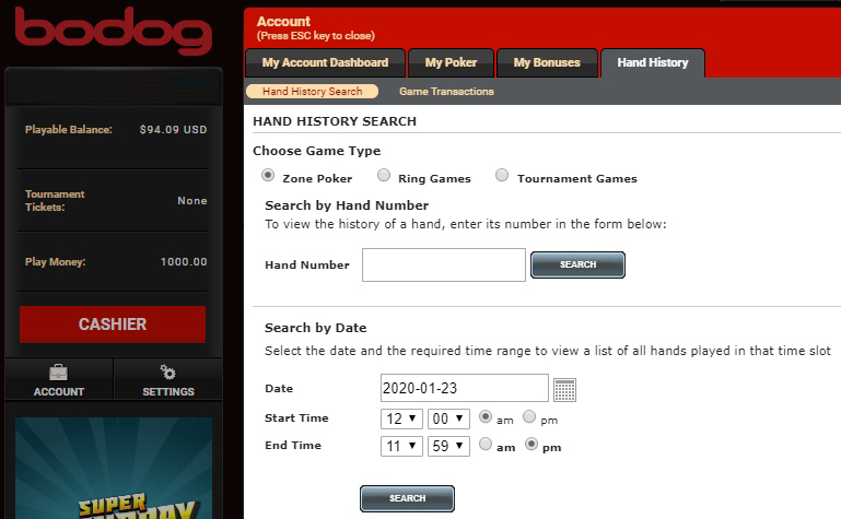 Однако, историю рук можно скачать без проблем — для этого в разделе «Account» есть отдельная вкладка. Там же можно увидеть сборную информацию по имеющимся билетам («My Poker») и бонусам («My Bonuses»).