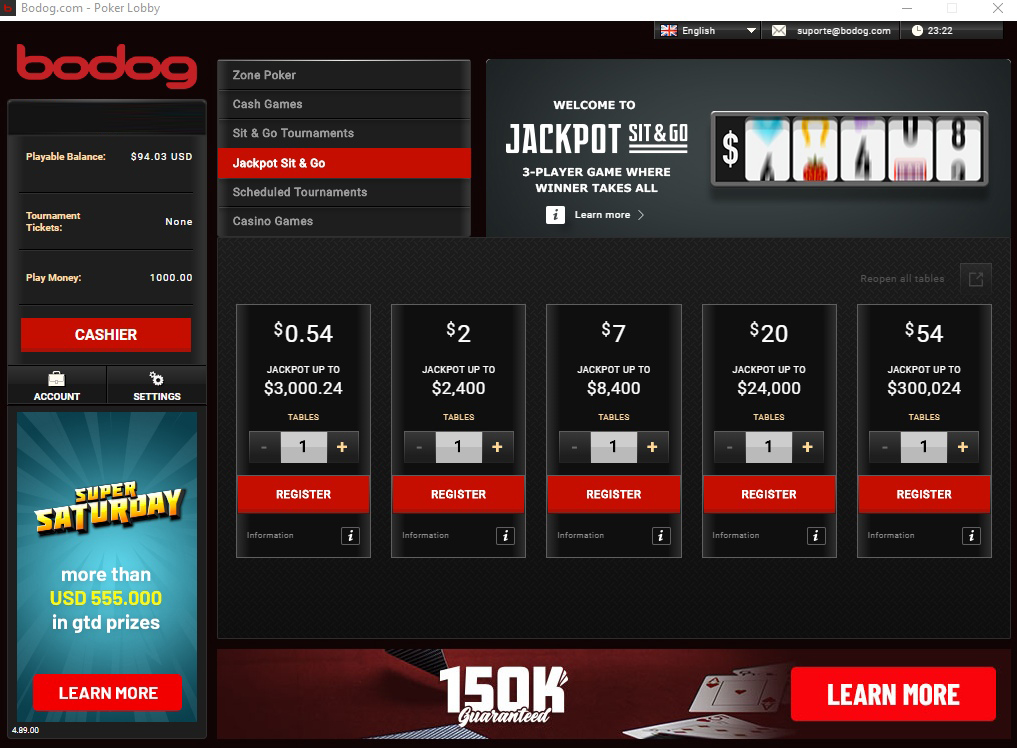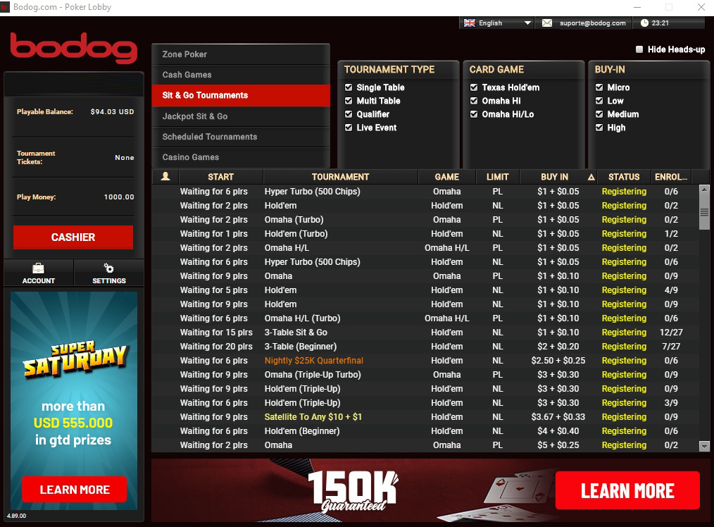 В Bodog представлено множество вариантов SnG: шесть видов NLH, два — FLH, четыре — PLO и пять — PLOHi/Lo, в том числе Turbo, Hyper-Turbo, Triple-Up и другие типы. Наиболее многочисленные SnG рассчитаны на 27 человек, но они заполняются достаточно медленно — в отличие от преобладающих там 6-max и heads-up турниров.
