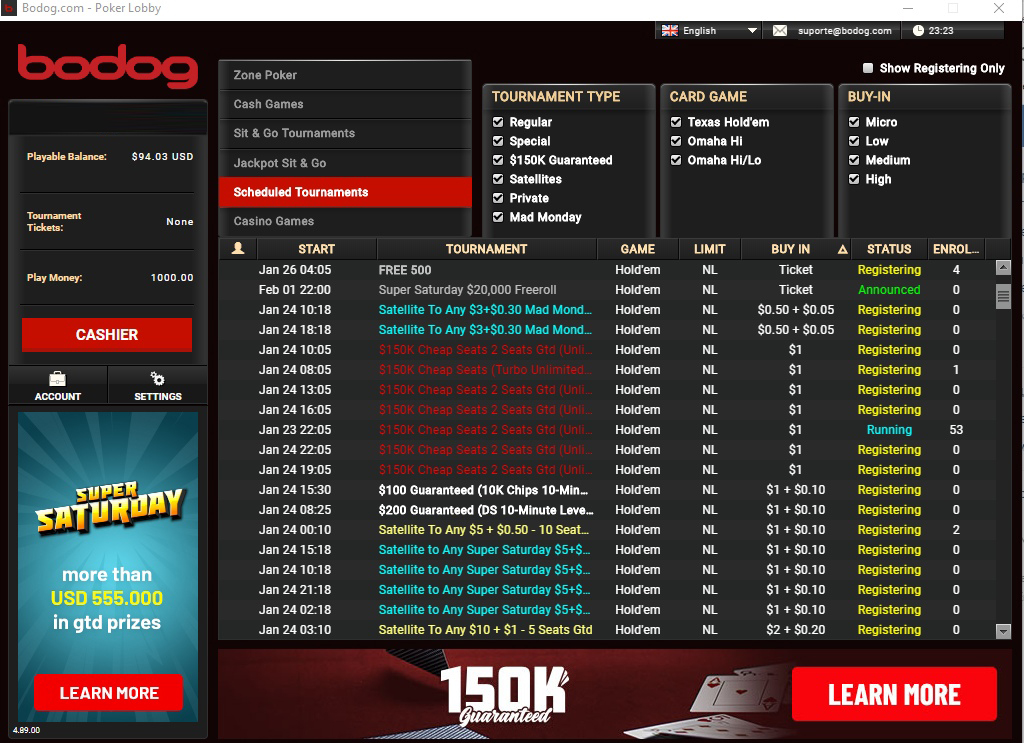 В лобби можно найти довольно много MTT по NLH, FLO Hi/Lo, PLO Hi/Lo и PLO с бай-инами от $0.55 и гарантиями от $100, в том числе сетку сателлитов на наиболее дорогие турниры.