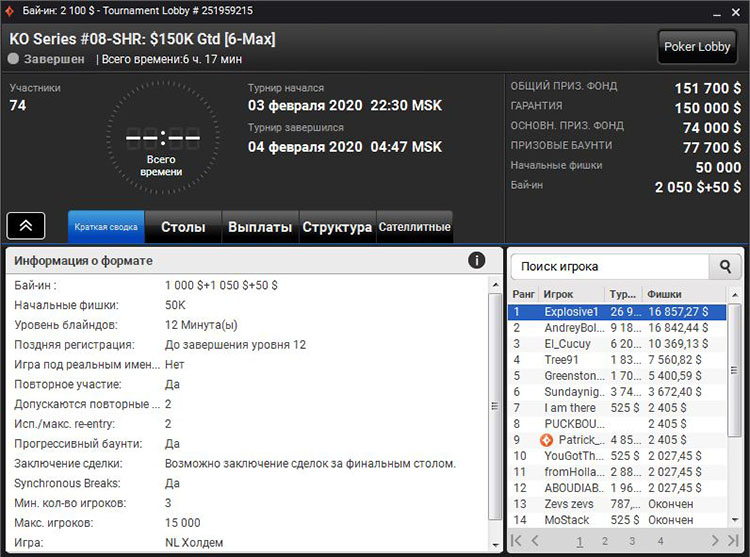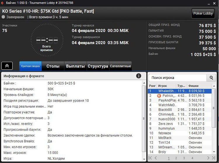- +$12.650 за 2-е место в турнире #10-HR $75K GTD