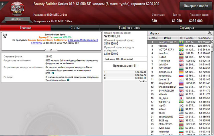 Другим крупным турниром Bounty Builder Series стал $1.050 BBS #012 ($200K GTD). Это событие собрало 239 входов. А победителем стал игрок из Бразилии Келвин «Kelvin_FP:AR» Кербер (Kelvin «Kelvin_FP:AR» Kerber). Судя по графику на SharkScope, «Kelvin_FP:AR» может к концу серии дойти до отметки в $1.000.000 призовых.