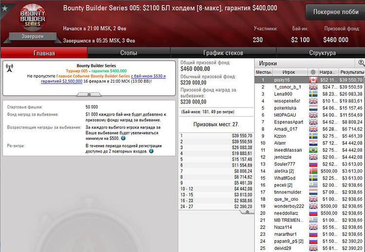 На PokerStars первым дорогим турниром стал $2.100 BBS #005 ($400K GTD). В событии было зарегистрировано 230 входов. Победителем стал канадец «pisky16». Он заработал более $91.000. Неплохой занос, учитывая, что график «pisky16» на SharkScope покорно ползёт вниз под углом 45 градусов.