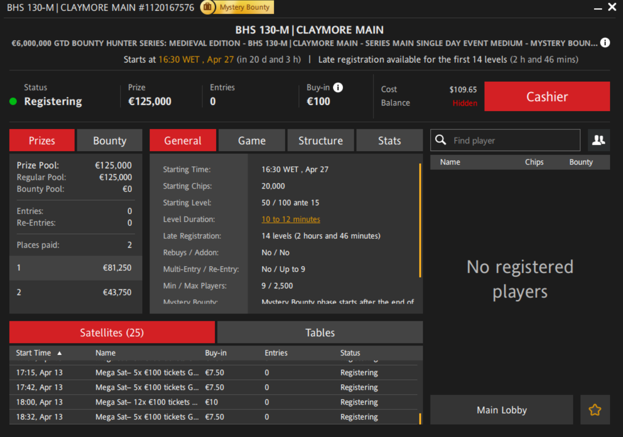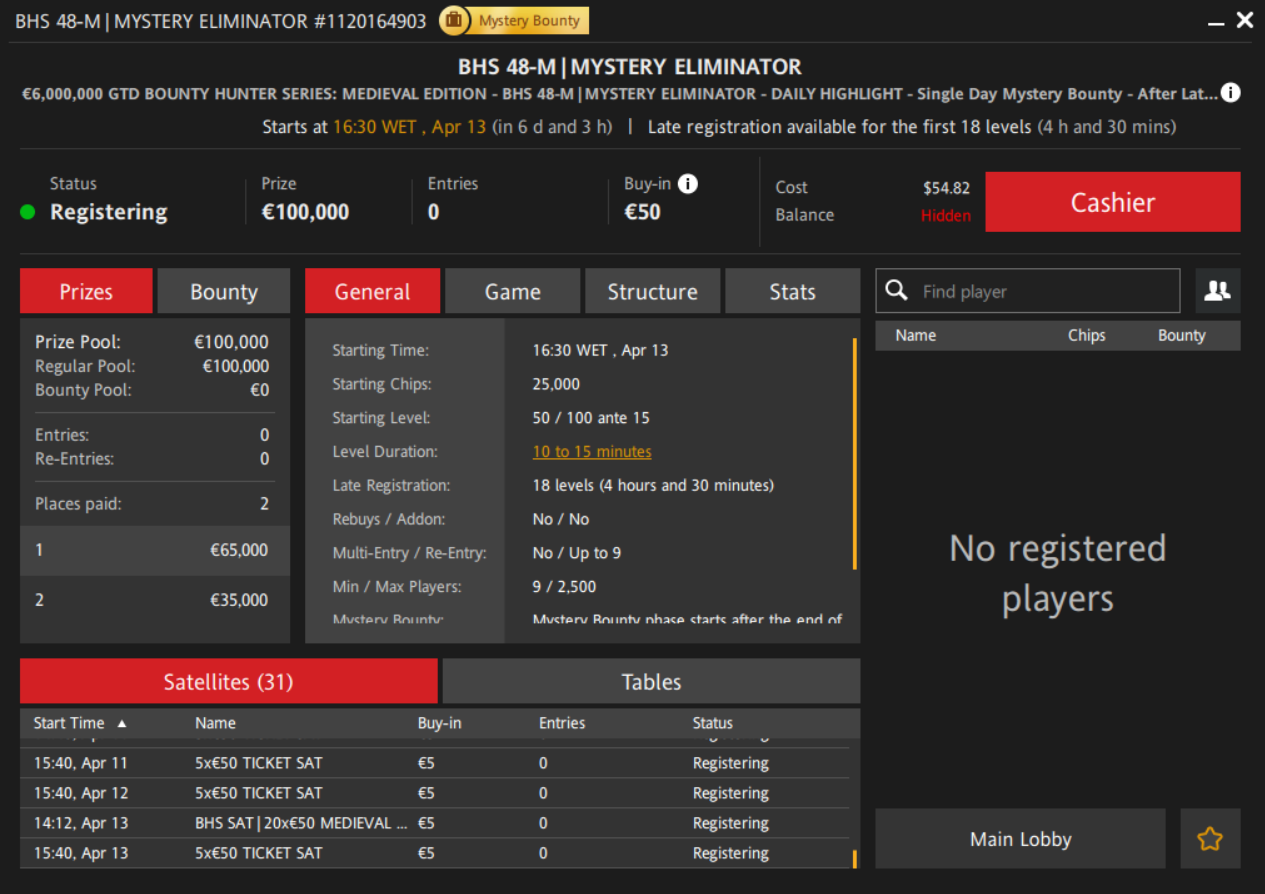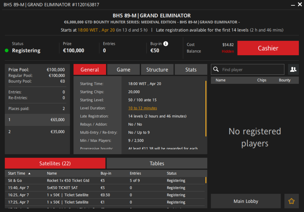 Каждый час для турнира проходят сателлиты за €0.50 — 5, в которых гарантирован от 1 до 5 билетов. Единственный крупный сат — €5 BHS SAT | 20x€50 — стартует 13 апреля в 16:12 МСК.