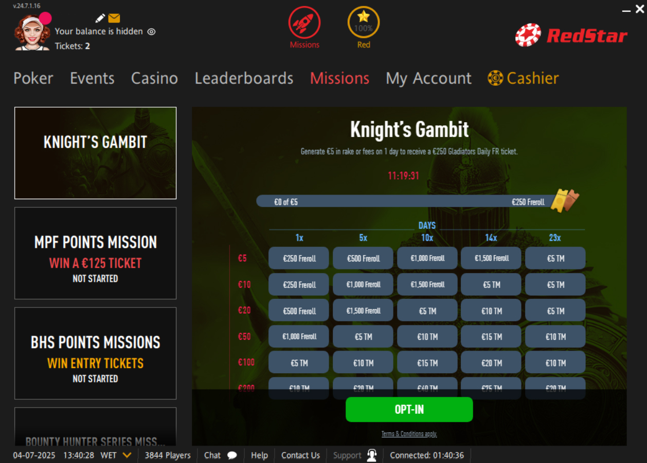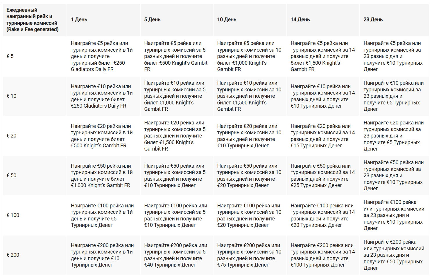 Их назвали Knight’s Gambit — Королевский Гамбит на русскоязычной версии сайта, хотя правильный перевод это Рыцарский Гамбит. Миссии ежедневные и однотипные формата Revenue — игроку нужно набивать фиксированные суммы рейка, чтобы получать разные призы. Чем больше дней с 6 по 28 апреля он выполняет миссию — тем больше призов получит.
