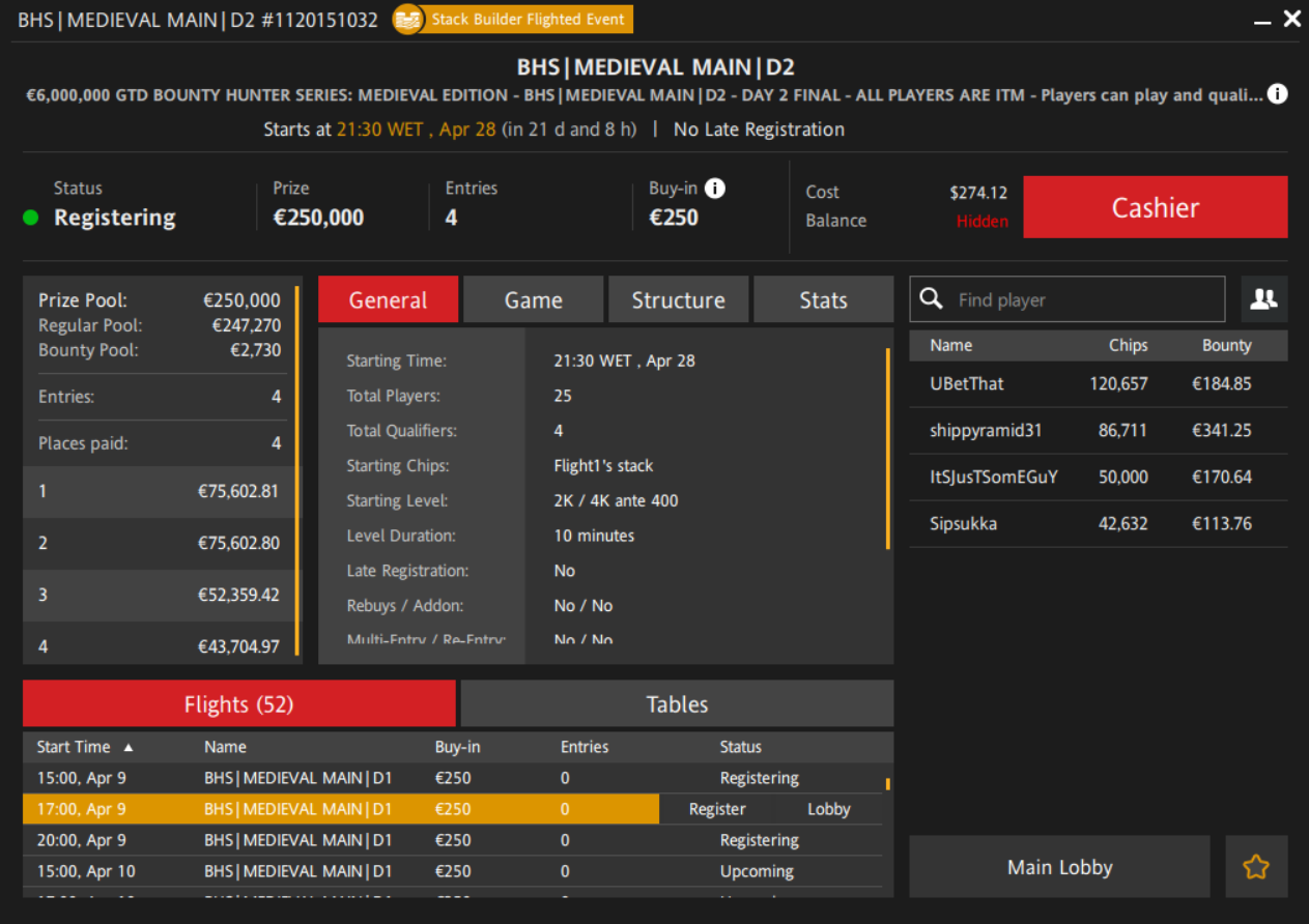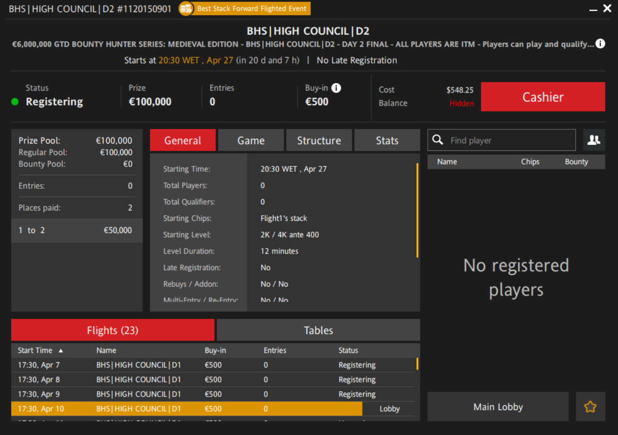 Сыграть можно любое число флайтов, но в Day 2 перейдёт только один наибольший стек. Day 2 стартует 28 апреля в 23:30 МСК. Попасть во флайты можно через сателлиты за €20 каждые 2 часа в :20 минут.