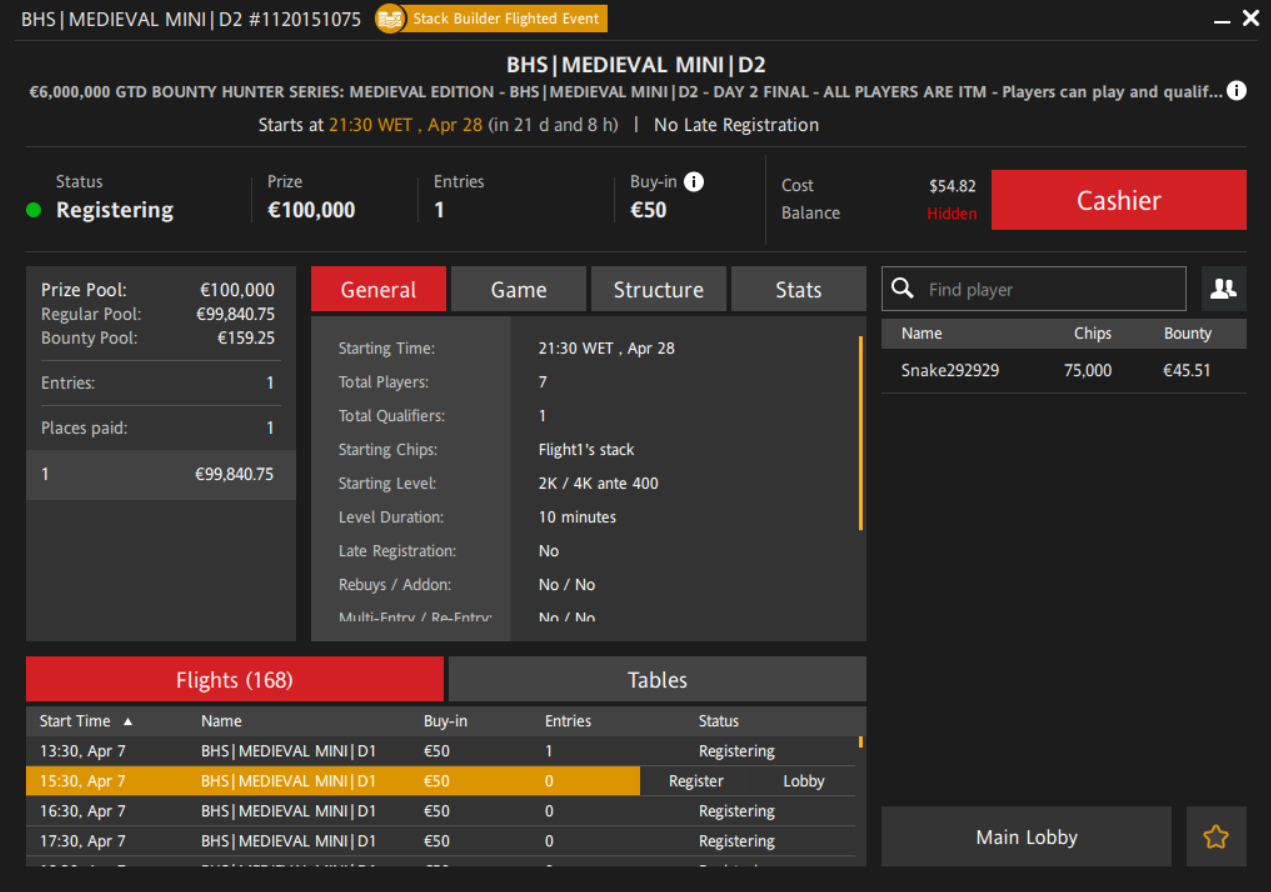 Сыграть можно любое число флайтов, но в Day 2 перейдёт только один наибольший стек. Day 2 стартует 27 апреля в 22:30 МСК. На начало серии сателлитов для этого турнира не было.