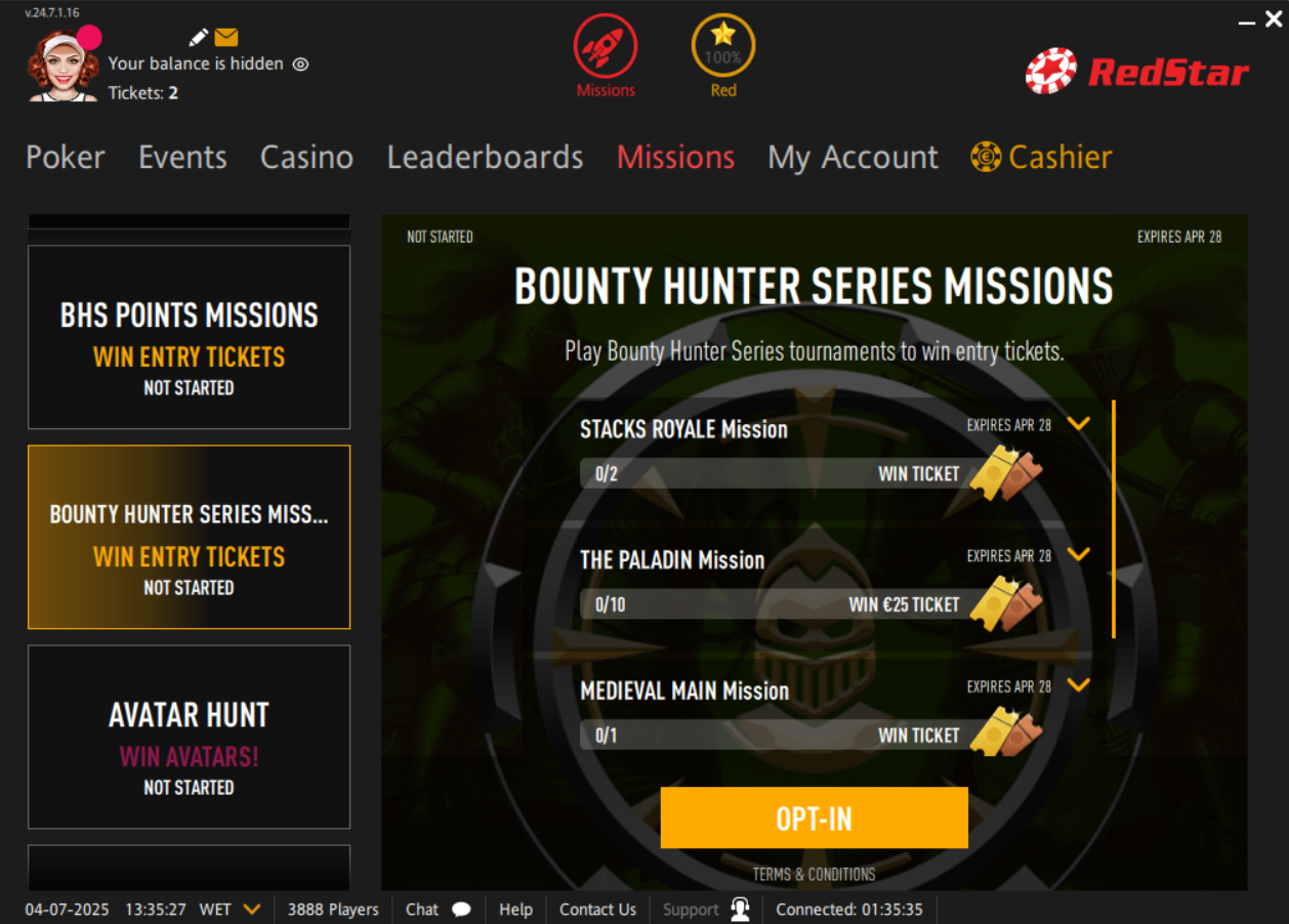 - Revenue — Path to The Knight I: цель — набить 1К бонусных очков (€100 рейка). Приз — билет €5 BHS Main Step. С 6 по 27 апреля можно выполнить эту миссию 4 раза.