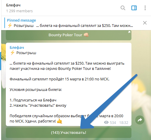 Нужно подписаться на телеграм-канал Блефач, нажать на кнопку "Участвовать" в сообщении о конкурсе и надеяться на удачу. Вы можете быть зарегистрированы на БестПокере от Покероффа или от любого другого аффилейта, можете вообще не иметь аккаунта там для участия в конкурсе. Если выиграете — придется зарегистрироваться.