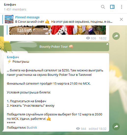 Покерофф совместно с телеграм-каналом Blefach разыгрывали билеты в онлайн-сателлиты на «Kings of Tallin», достаточно было просто подписаться на канал и принять участие в конкурсе. И надо же такому было случиться — читатель Chebbaka выиграл пакет на серию.