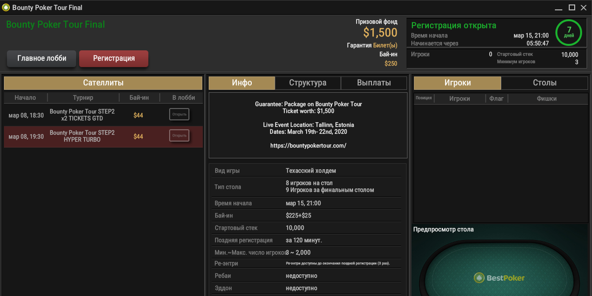 С 19 по 22 марта в Таллине в Olympic Park Casino состоится новая серия — Bounty Poker Tour. И снова BestPoker проводит онлайн-сателлиты, в каждом из которых разыгрывается гарантированный пакет стоимостью $1500. В него входят: