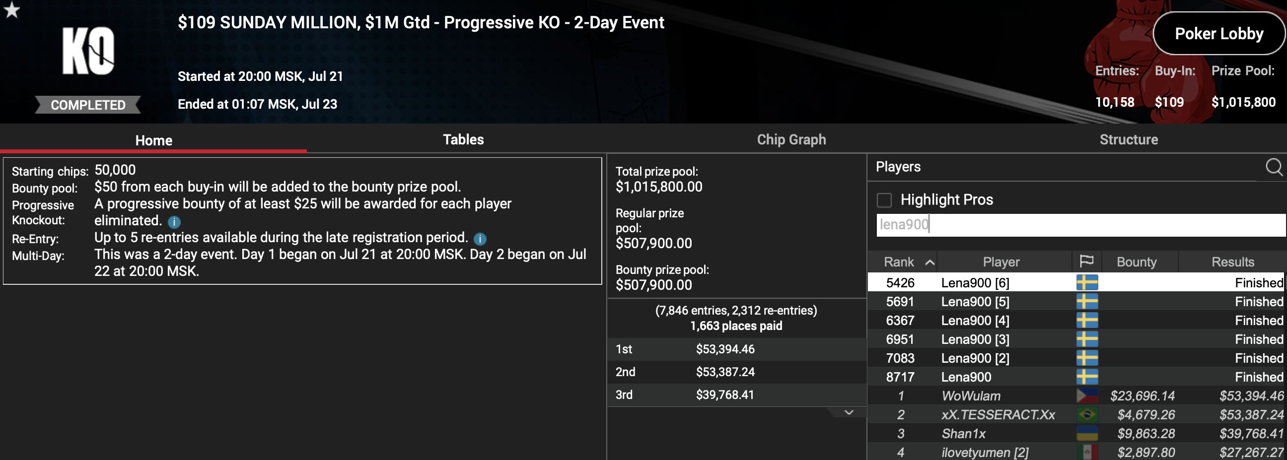 В подтверждение своим словам в первое воскресенье после Main Event WSOP Никлас Астедт загрузил свою дефолтную сессию на GGPoker и PokerStars. Низ загрузки — турниры по $109. Например, его можно было встретить за одним столом в $109 Sunday Million: этот турнир lena900 ещё не выигрывал.
