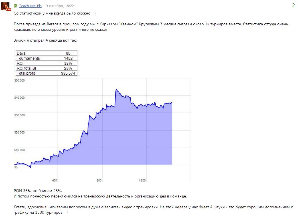 Последние полгода я полностью сфокусировался на тренерской деятельности. И если до этого мой опыт заключался в основном в почасовом обучении и разработкой персональный программ развития игроков, то теперь я учу ребят играть МТТ без фиксированной оплаты. Но имею возможность вкладывать в их игру дeньги. Такая схема открывает очень интересные возможности. Интересы игрока и тренера в этом случае нигде не пересекаются и каждый может быть уверен в максимальной отдаче от усилий, которые он прикладывает. Поподробнее я возможно еще напишу, но пост не об этом.
