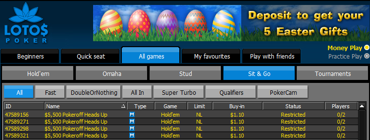- Желательно играть на специально созданных столах в руме Lotos Poker, которые находятся тут: Sit&Go -> All. В случае каких-либо технических неполадок, вы можете договориться с оппонентом сыграть свой матч и на обычном Sit&Go столе (не Turbo, не Hyper-Turbo, только NLHE HU Sit&Go с обычной структурой).