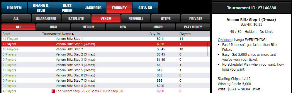Venom Cyclones Blitz — серия степ-сателлитов в формате Blitz (быстрый покер): можно выходить из-за стола и возвращаться в игру в любой момент.