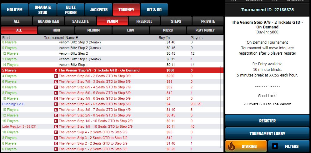VenomFever — прямые сателлиты на The Venom, в которых разыграют 1,000 билетов. Бай-ины от $32 до $215. Гарантии от 1 до 20 билетов. Чтобы найти самые крупные сателлиты, перейдите во вкладку Tourney — Venom и введите «MEGA» в фильтрах.