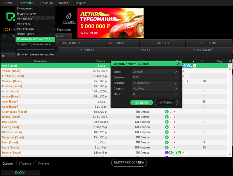 Играть своей компанией в кешик можно и на Покердоме. Для этого зайдите в рум в раздел «Настройки» — «Создать приватный стол». На выбор NLHE, 6+, PLO, PLO8, Stud, Stud Hi/Lo. Игра только в российских рублях в формате 6-макс с блайндами от 5 – 10 до 500 – 1000 рублей.
