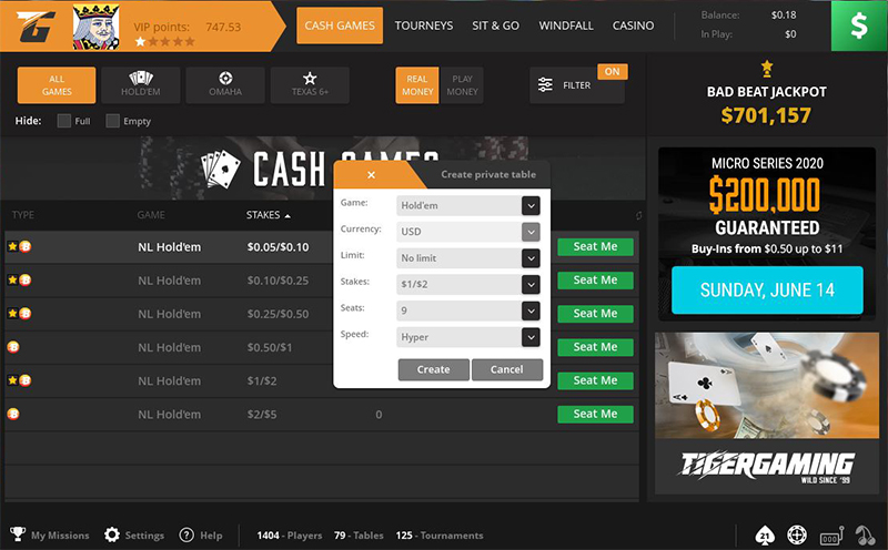 Возможность создать приватную игру доступна на TigerGaming. Для этого нужно в нижней части экрана выбрать «Settings» — «Create Private Game». В настройках игры на выбор NLHE, Americana, PLO, PLO8, Stud, Stud Hi/Lo, 32 Draw в долларах на блайндах от $1 – $2 до $100 – $200 в формате 6-макс и 9-макс.