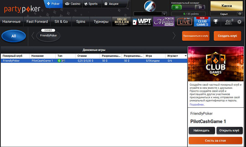В начале июня на partypoker появились приватные игры. Pokeroff писал подробный гайд о том, как создавать игры в Club Games. Сейчас игрокам доступны кеш-игра по Холдему и Омахе в формате хедз-ап, 6-макс и 8-макс на блайндах от 1 – 2 центов до $1 – $2 с закупкой 10, 50, 100 и 200 бб.