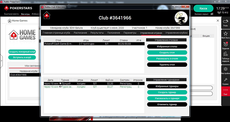 Затем на выбор игроку доступно или создать кеш-игру, или создать турнир.