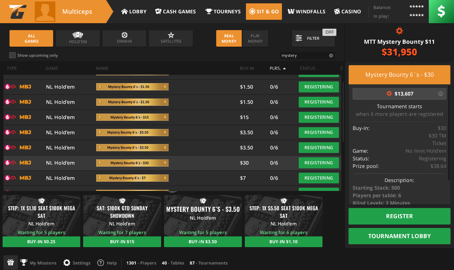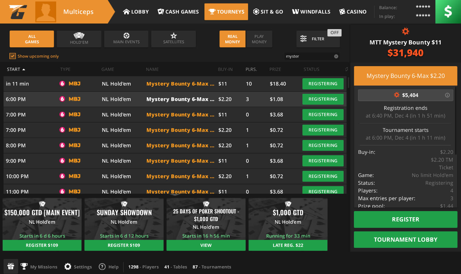 Кроме Sit&Go, на TigerGaming есть также ежедневные МТТ с Mystery Bounty, в которых награды за нокауты тоже выплачиваются из общего джекпота, а не части призового фонда. На 4 декабря в лобби доступны два бай-ина: