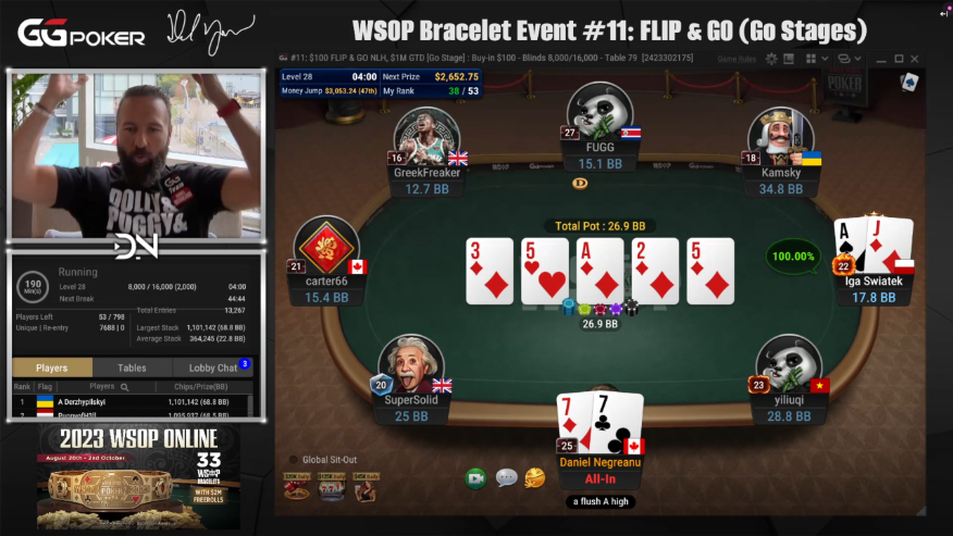 В 2023 году амбассадор GGPoker и самый популярный покерист мира по версии TheHendonMob Даниэль «DNegs» Негреану впервые за два года вернулся к стримингу онлайн-покера. Часть WSOP Online он провёл в Канаде, откуда стримил свою игру через Twitch. Одной из целей этого мероприятия была попытка затащить мультифлайтовый $100 FLIP & GO $1M Gtd.