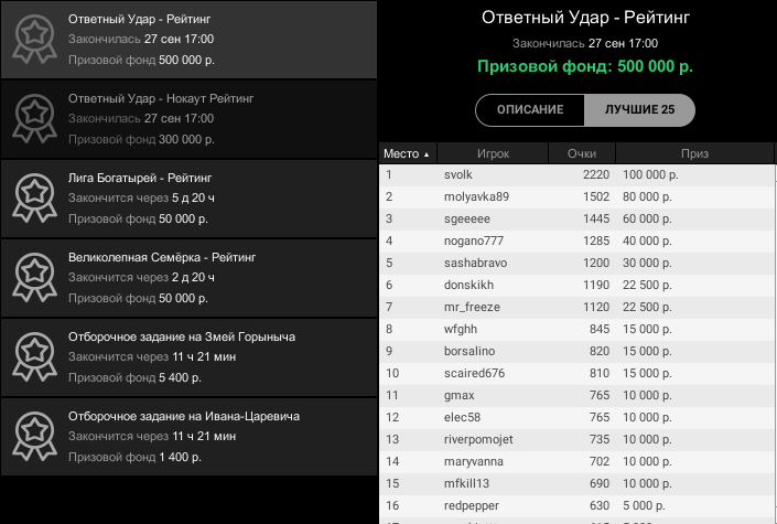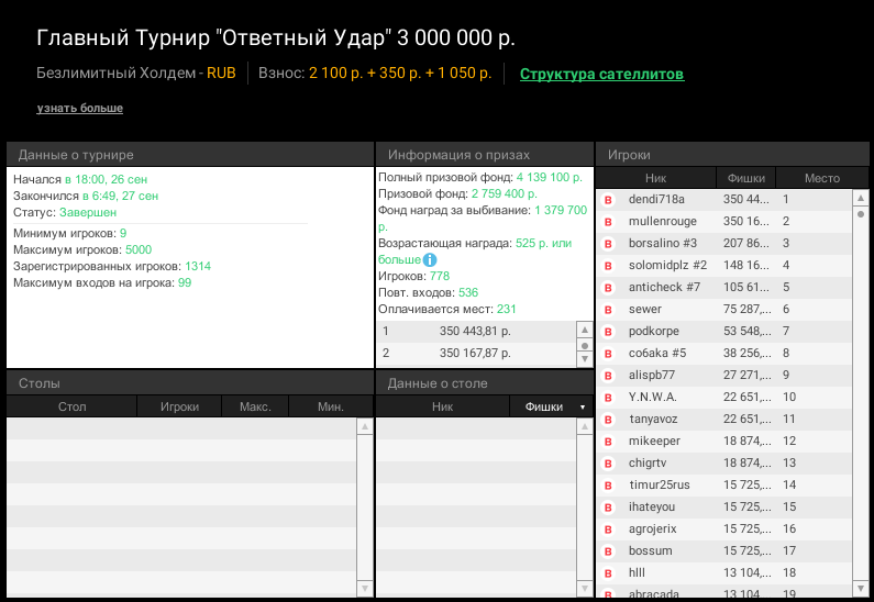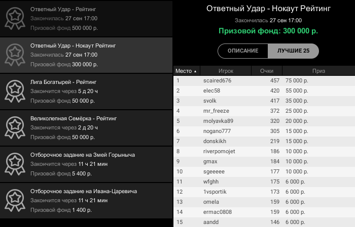 Выплаты финалистам ₽3,500 Главный Турнир «Ответный удар»