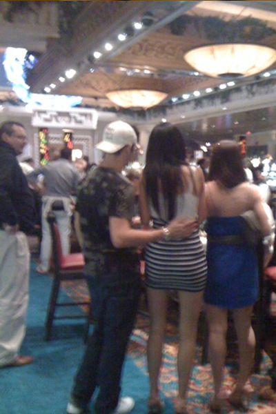 На снимке Джо, в гавайской рубашке и бейсболке PokerStars, обнимает красавицу Николь за талию, вызывая завистливые взгляды окружающих мужчин. Любители покера (и как оказалось сплетен) уже успели пережевать информацию о том, что девушка выше Джо Кады, но на самом деле это не так, ведь Николь была на довольно внушительных каблуках.