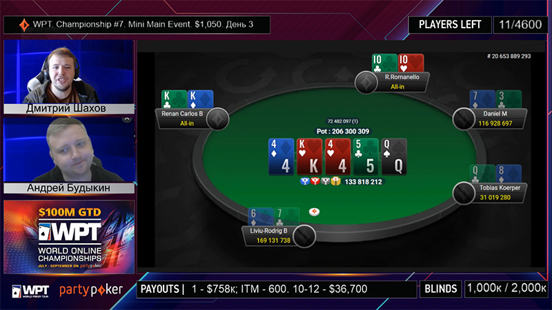 Cегодня определится победитель в $1.050 Mini Main Event Championship. В игре осталось девять участников. Чиплидер финального стола игрок, выступающий под флагом Великобритании, Ливиу-Рогрид Барта (Liviu-Rogrid Bartha). Лиу эффектно оформил финальный стол турнира, поставив 3-бет с парой Дам на рейз из UTG от Даниэля Монтаньолли (Daniel Montagnolli) с АК.