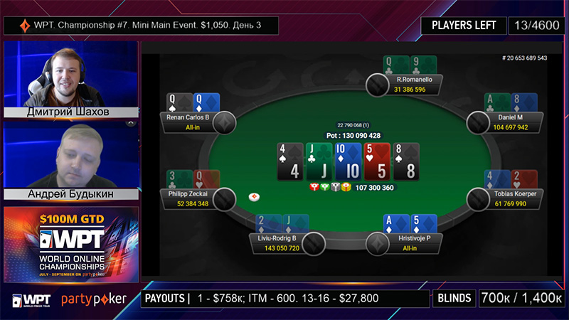 Игра продолжится сегодня в 21:05 МСК. Прямая трансляция на русском языке начнется в 22:00 МСК на канале /partypokerRU. Помогать Дмитрию Шахову будет Илья Городецкий.