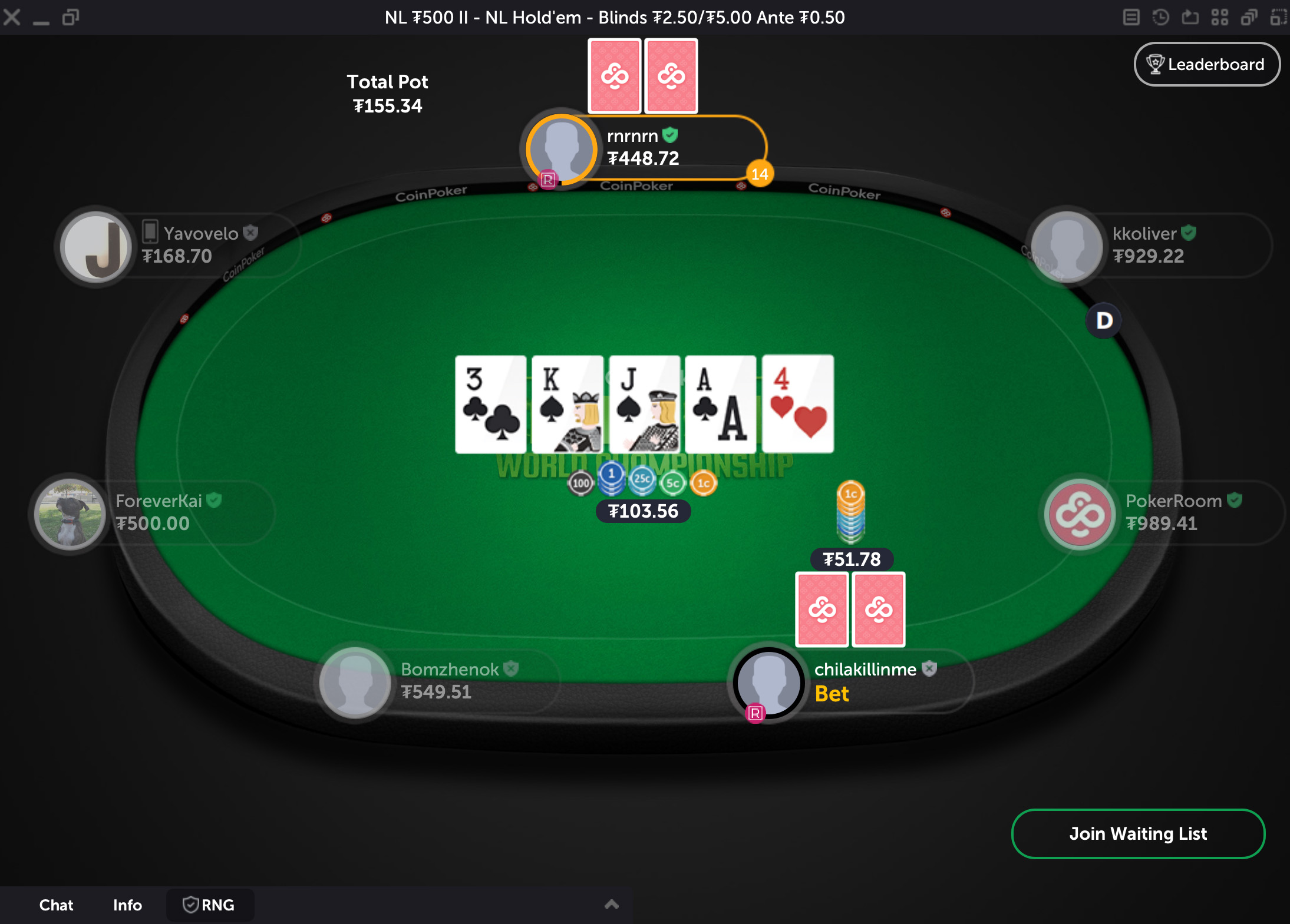 Очки обновляются каждые 60 секунд. Отслеживать прогресс можно, кликнув на иконку "Leaderboard" за кеш-столом.