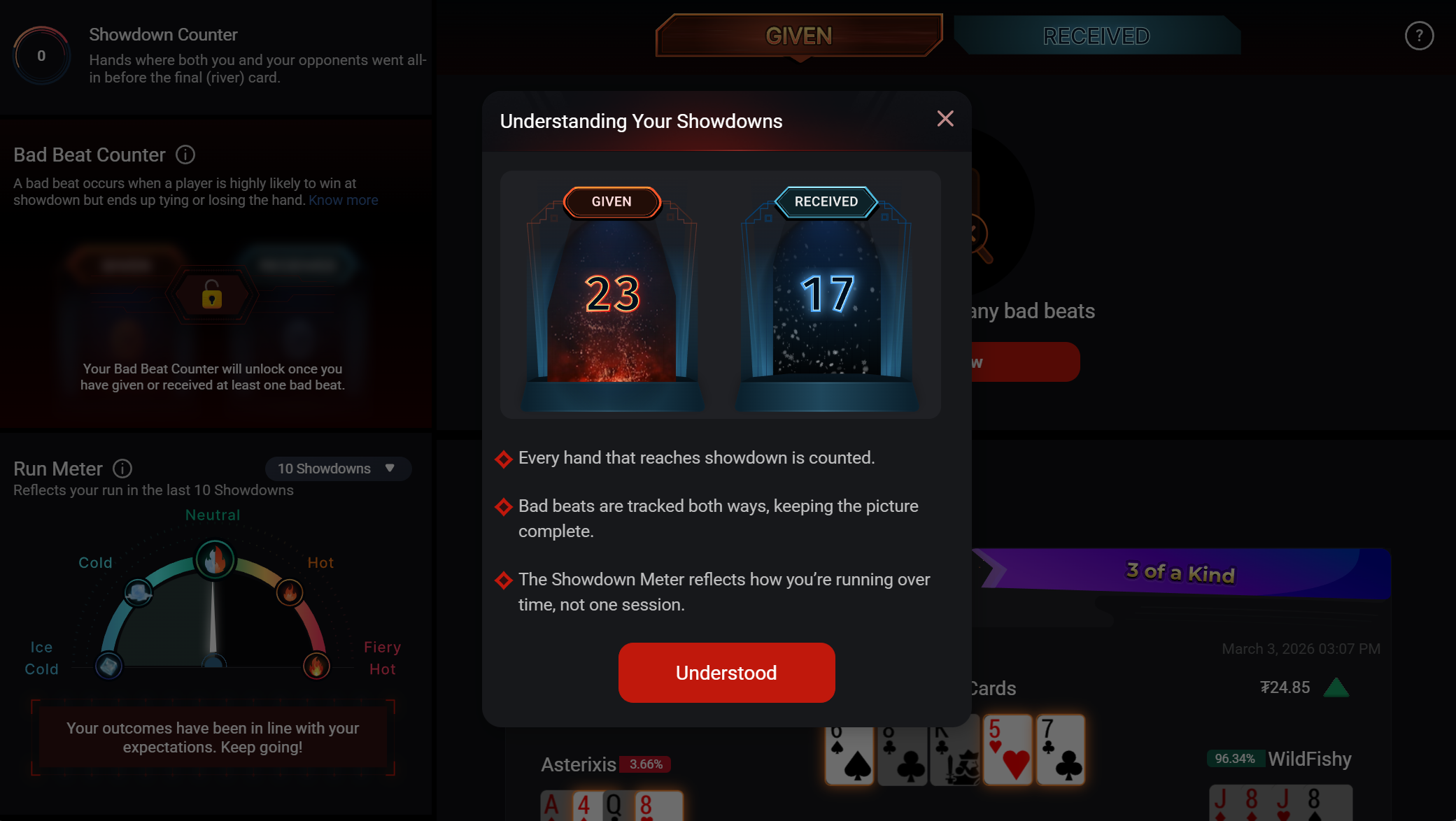 Второй — Showdown Meter — собирает информацию по всем шоудаунам игрока, учитывая бэдбиты и оценивая, насколько хорош ран игрока на дистанции при помощи специального «термометра» от ледяного рана (Ice Cold) до раскалённого рана (Fiery Hot).