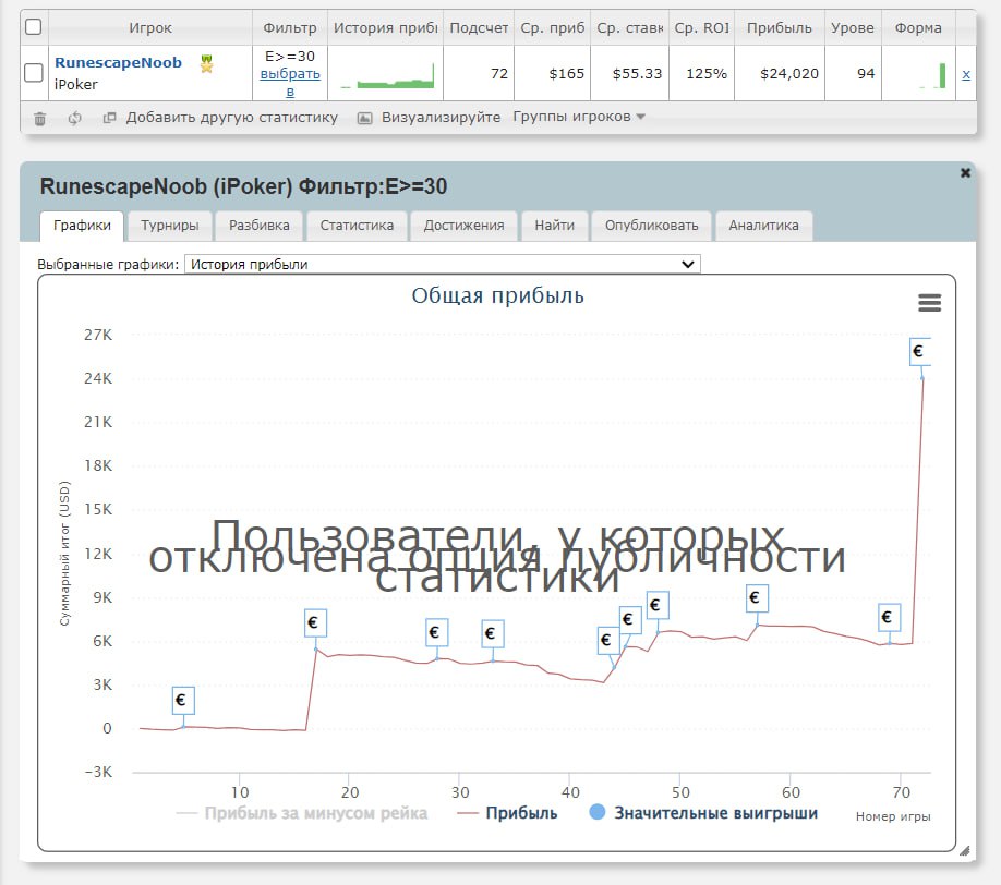 Интересно, что сбор публичной статистики у него отключён, но SharkScope всё же засчитал ему 72 турнира ABI$55 — его профит с учётом последней победы превышает $24K.