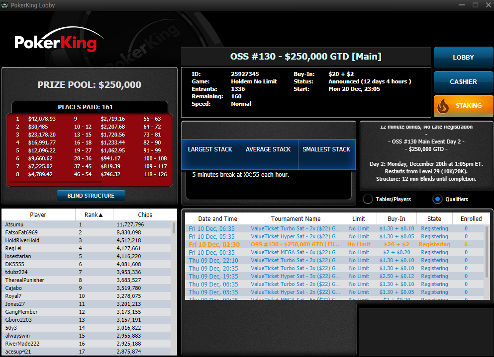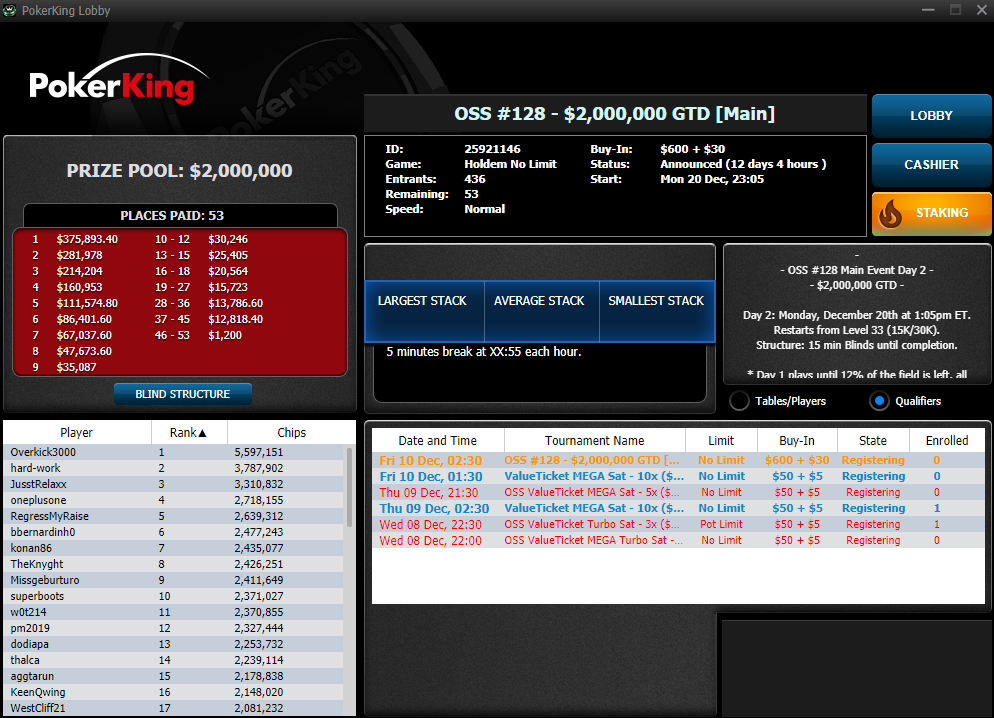 Флайты всех трёх турниров стартуют 6 декабря, а Day 2 — 20 декабря. В Day 2 переходит 12% игроков. Это зона ITM. Минимальная выплата будет равна двум бай-инам (кроме $215 OSS #129, где минимальная выплата будет равна одному бай-ину в $200).