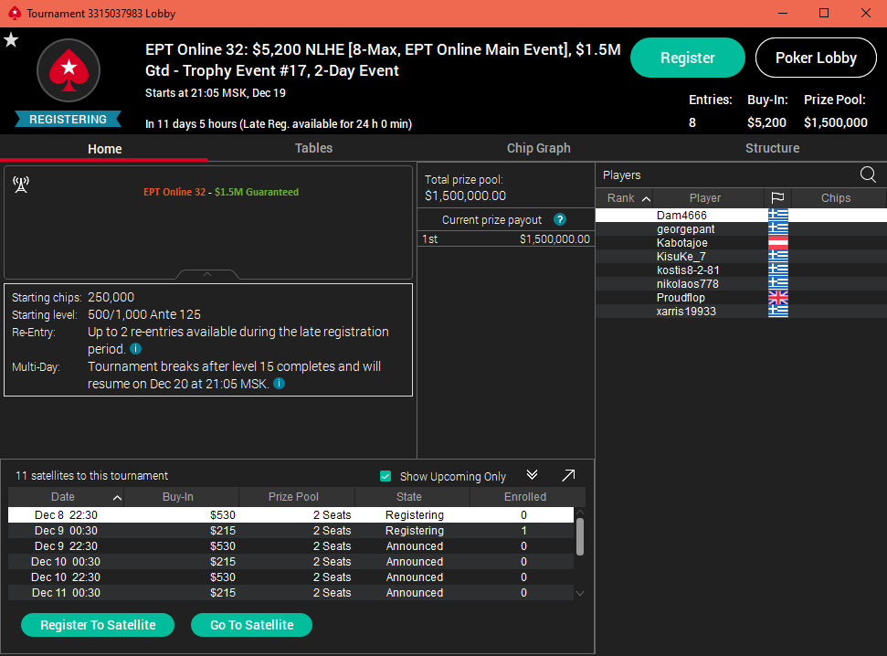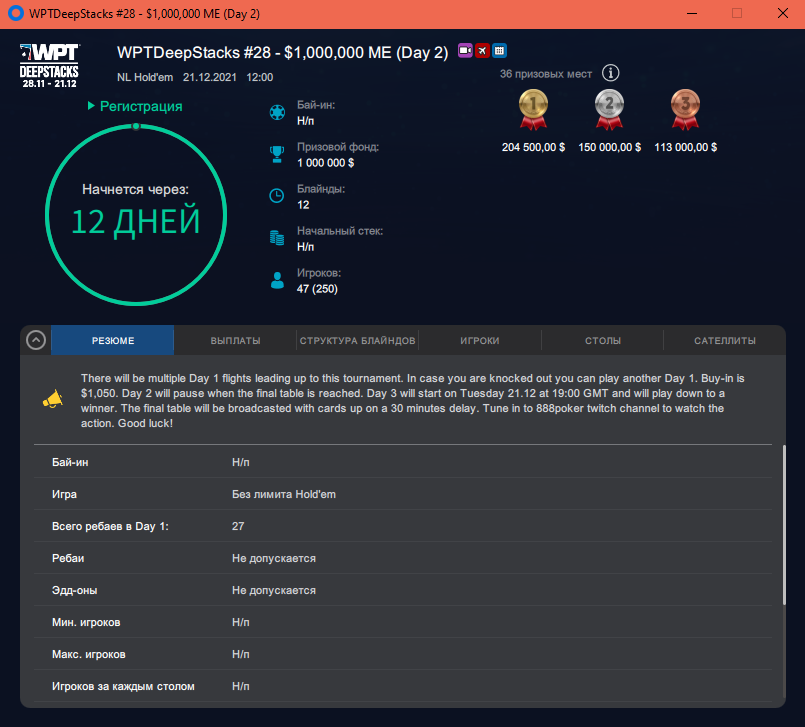Главное событие с бай-ином $1050 и гарантией $1M будет двухдневным, со множеством стартовых флайтов вплоть до 20 декабря. Первые дни играются 18 уровней по 12 минут, либо пока не останется 14% участников.