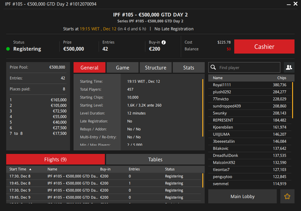 Главных событий в расписании несколько, но самое крупное ещё впереди — многодневный IPF #105 с бай-ином €200 и гарантией €500K. Стартовые флайты проходят на RedStar Poker каждый день в 20:30 МСК и 22:45 МСК вплоть до 12 декабря. Отборы в турнир начинаются от €10.