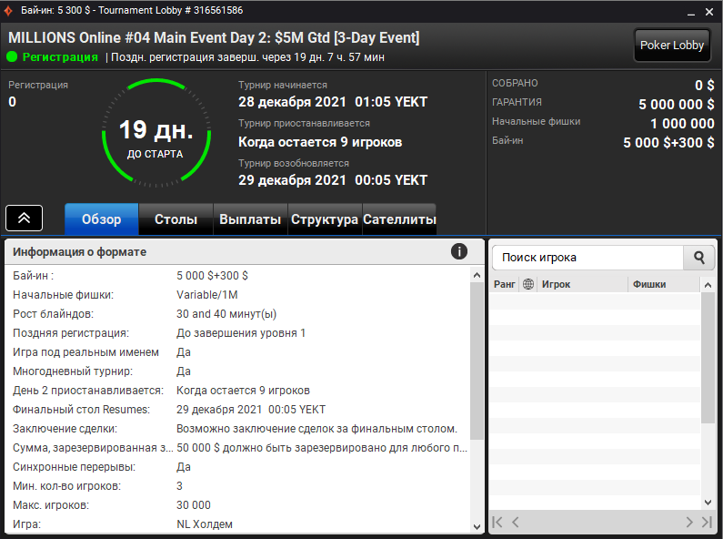 Главное событие пройдёт с бай-ином $5300 и гарантией $5M аналогично Старзовскому. Но в случае partypoker турнир с несколькими стартовыми флайтами: